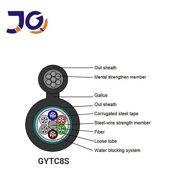 GYTC8S to samonośny napowietrzny kabel światłowodowy przeznaczony do użytku zewnętrznego. Obsługuje od 1 do 144 włókien z konstrukcją z luźną tubą. Kabel składa się z drutu nośnego, zewnętrznej osłony PE, luźnych tub wypełnionych włóknem i żelem oraz opancerzenia z taśmy stalowej falistej dla odporności na zgniatanie i uderzenia. Centralny element wzmacniający z drutu stalowego zwiększa wytrzymałość na rozciąganie, otoczony materiałami blokującymi wodę. Idealny do instalacji napowietrznych, GYTC8S nadaje się zarówno do transmisji na duże odległości, jak i do sieci komunikacyjnych LAN.
