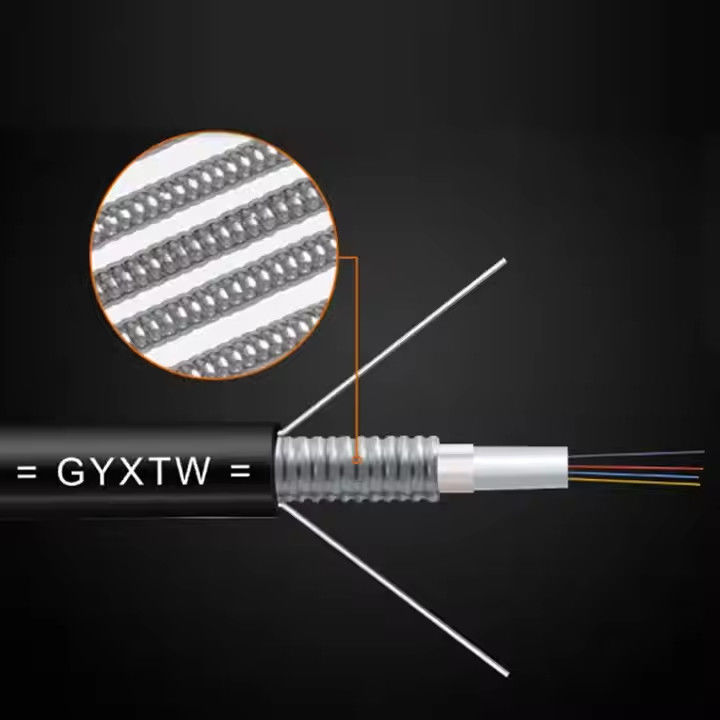 Kable z włókna GYXTW wykorzystują włókna jedno- lub wielomodowe umieszczone w luźnej rurze wykonanej z tworzywa sztucznego o wysokiej wytrzymałości, wypełnionej wodoodpornym żelem.Warstwa PSP jest owinięta wzdłużnie wokół rurkiDwa równoległe druty stalowe wzmacniają rdzeń kabla, a materiały zatykające wodę zapewniają kompaktową strukturę i niezawodną odporność na wodę.a cała konstrukcja jest chroniona zewnętrzną powłoką PE.